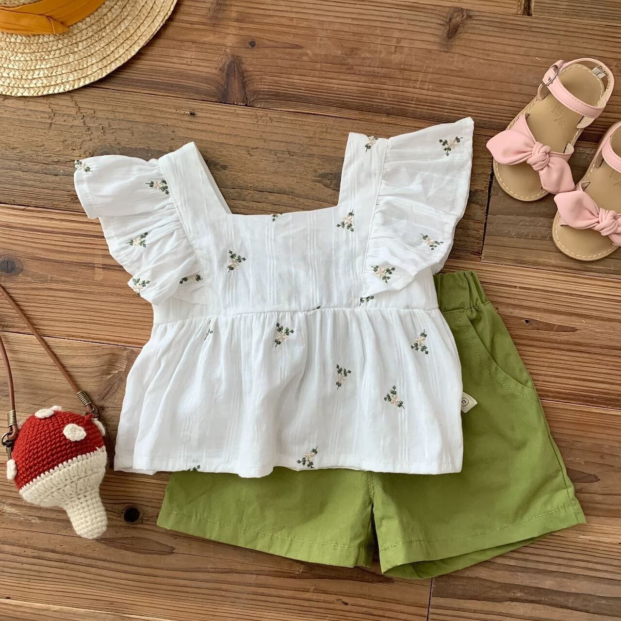 【発注】ノースリーブショルダーフリル花柄トップス+グリーンハーフパンツ[SU]